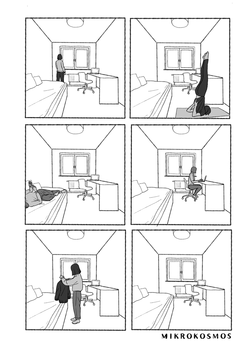 In kurzen Bildgeschichten wird der Mikrokosmos des eigenen Lebensraums im Wohnheim beleuchtet.