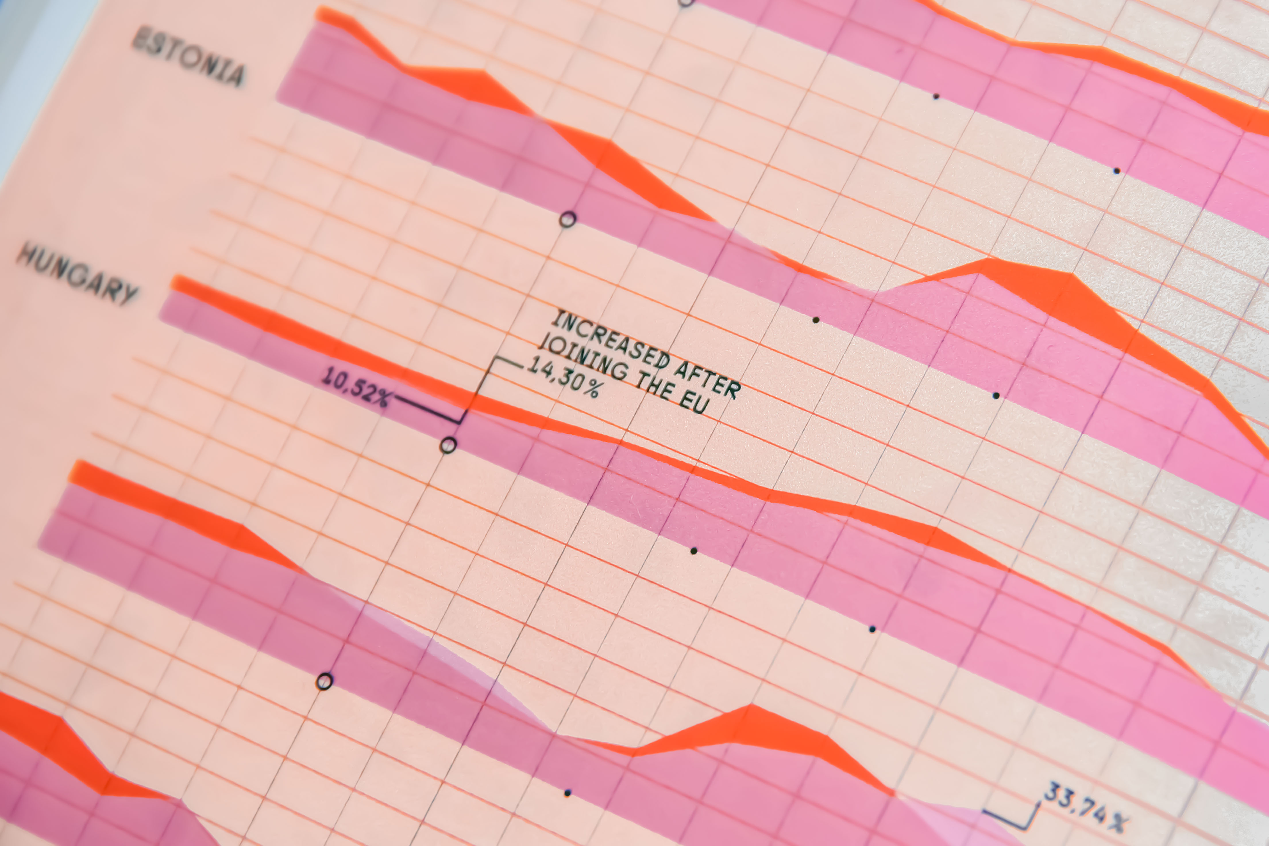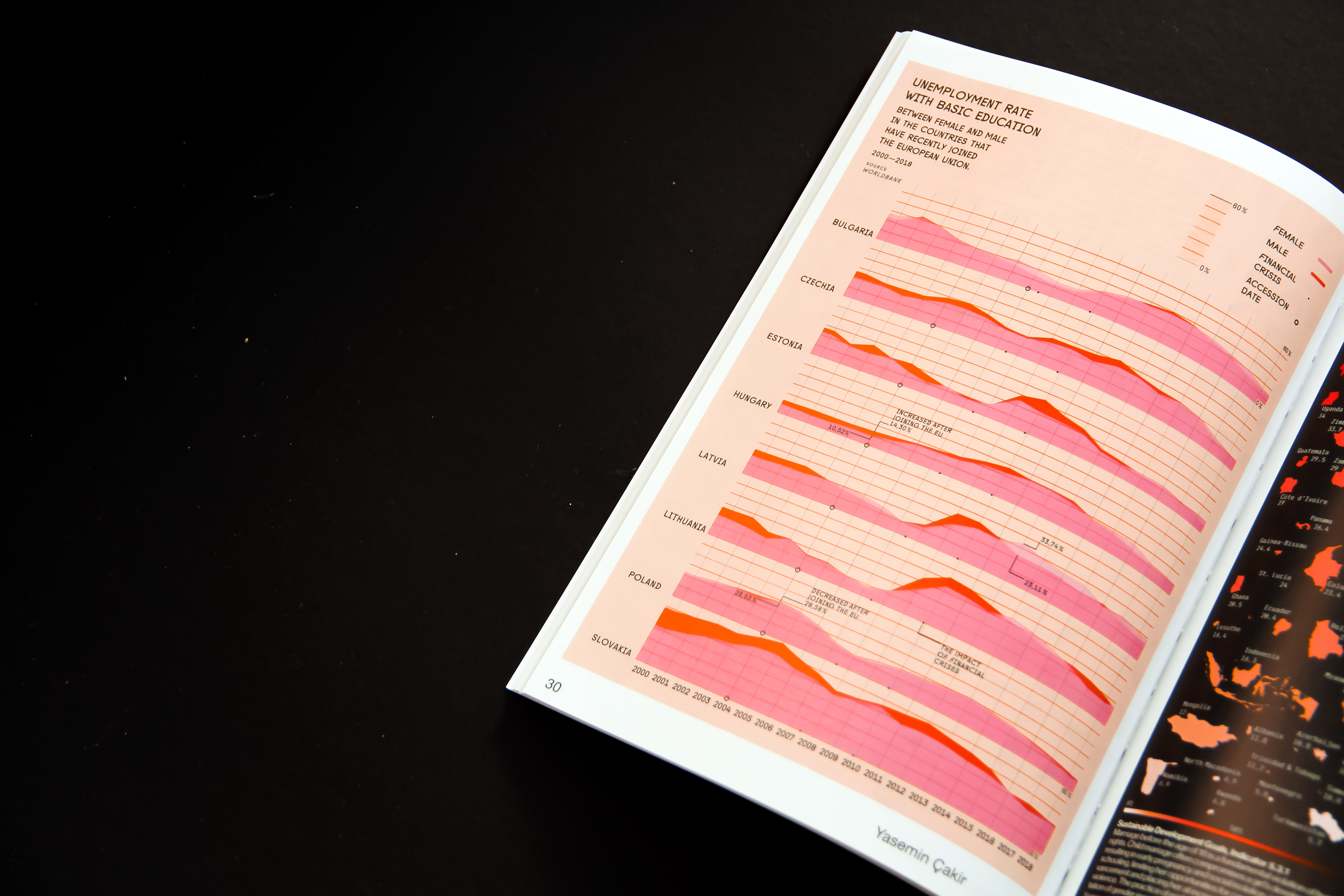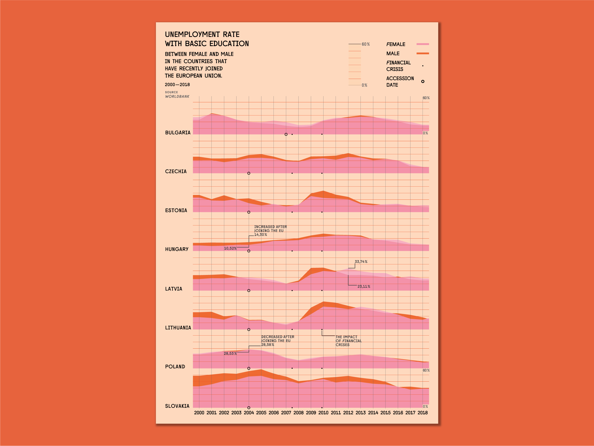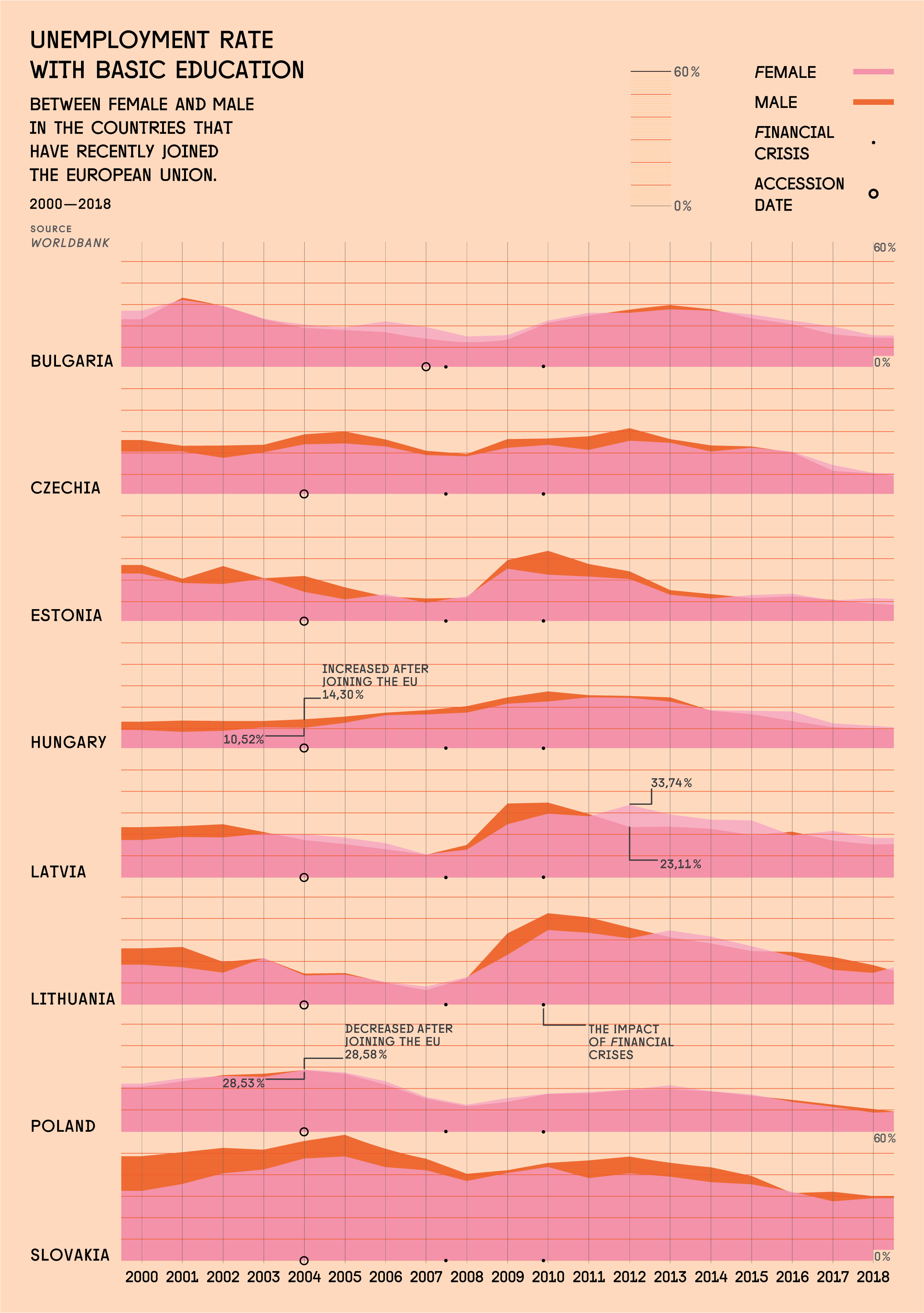 Das Flächendiagramm vergleicht die Arbeitslosenquote der weiblichen und männlichen Erwerbstätigen mit der gleichen Bildungsniveau in den Ländern, die kürzlich der EU beigetreten sind und setzt sie desweiteren in Relation zu den Auswirkungen der Finanzkrise in jedem Land.