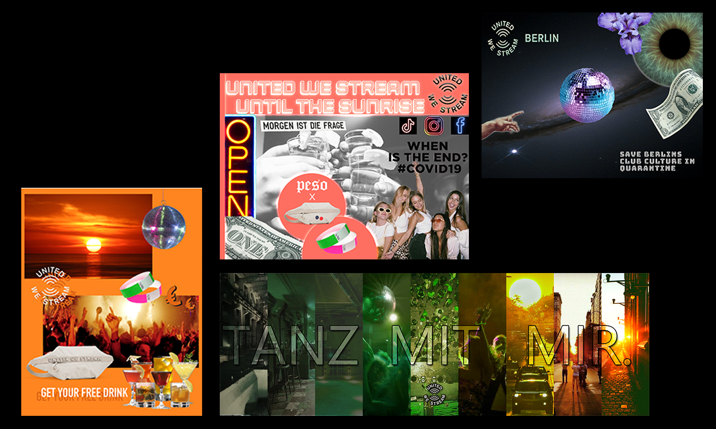 In der Einführungübung 'Creative Brief / Photoshop' haben Studierende Motive, wie Anzeigen, Memes, GIFs, Bildstrecken, Videos für virtuelle Social-Media-Kampagnen verschiedener Themenschwerpunkte entwickelt. Creative Briefs stellten die Grundlage für Moodboards und anschließende Entwürfe dar. Die meisten Studierenden entschieden sich für das Thema 'Spendenaktion gegen das coronabedingte Clubsterben', woraus im nachfolgenden Sommersemester die reale Kooperation mit United We Stream / Clubcommission entstand. Auch dem Thema 'Fridays for Future' oder anderen Inhalten widmeten sich einige Studierende.